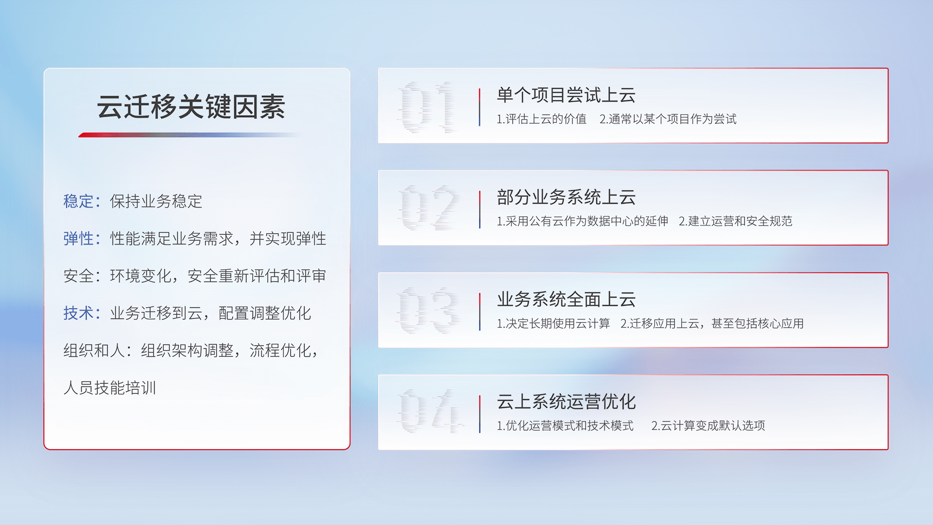 结合实际业务,,从规划设计、、、云平台选型、、、、云原生改造、、数据迁移、、集成交付,,迁移全过程为客户识别最佳上云路径,,做好风险识别管理,,设计网络架构、、、、身份权限、、、、安全审计合规、、、操作审计、、、日志审计、、监控告警策略、、多站点容灾设计等,,,,对云上基础设施进行整体规划,,提升IT治理水平,,,,以满足弹性、、、高可用、、高性能的需求。。。