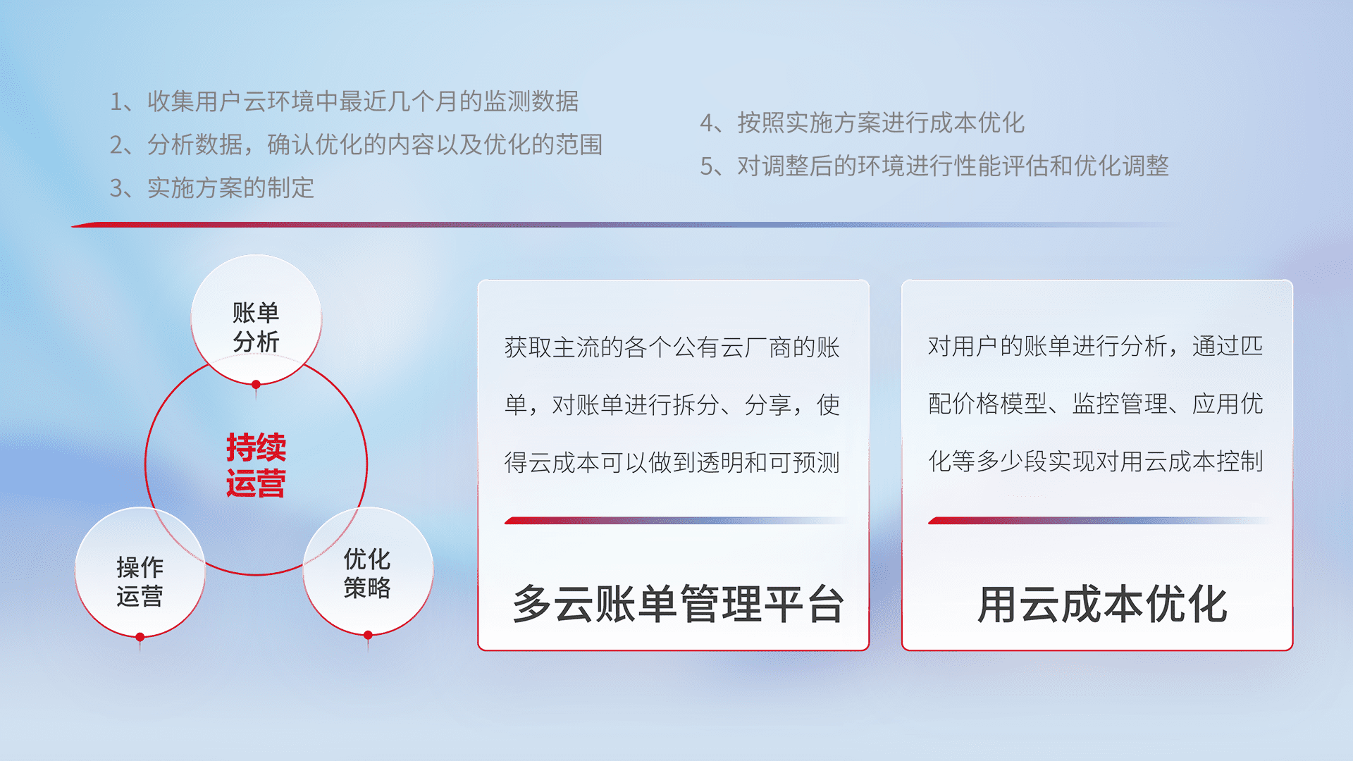 通过多云纳管,,,以统一的资源数据模型把客户的云资源进行抽象和封装,,,进而实现对多云资源的统一操作,,,保障云资源管理的可靠性、、、稳定性与可用性。。。量身定制化运维内容,,,配置、、、、开发运维、、、、补丁管理、、、备份、、、监控、、、、认证和访问管理、、、审计和日常巡检等,,,,保障在用云过程中的可靠度,,,,稳定度以及高可用率。。